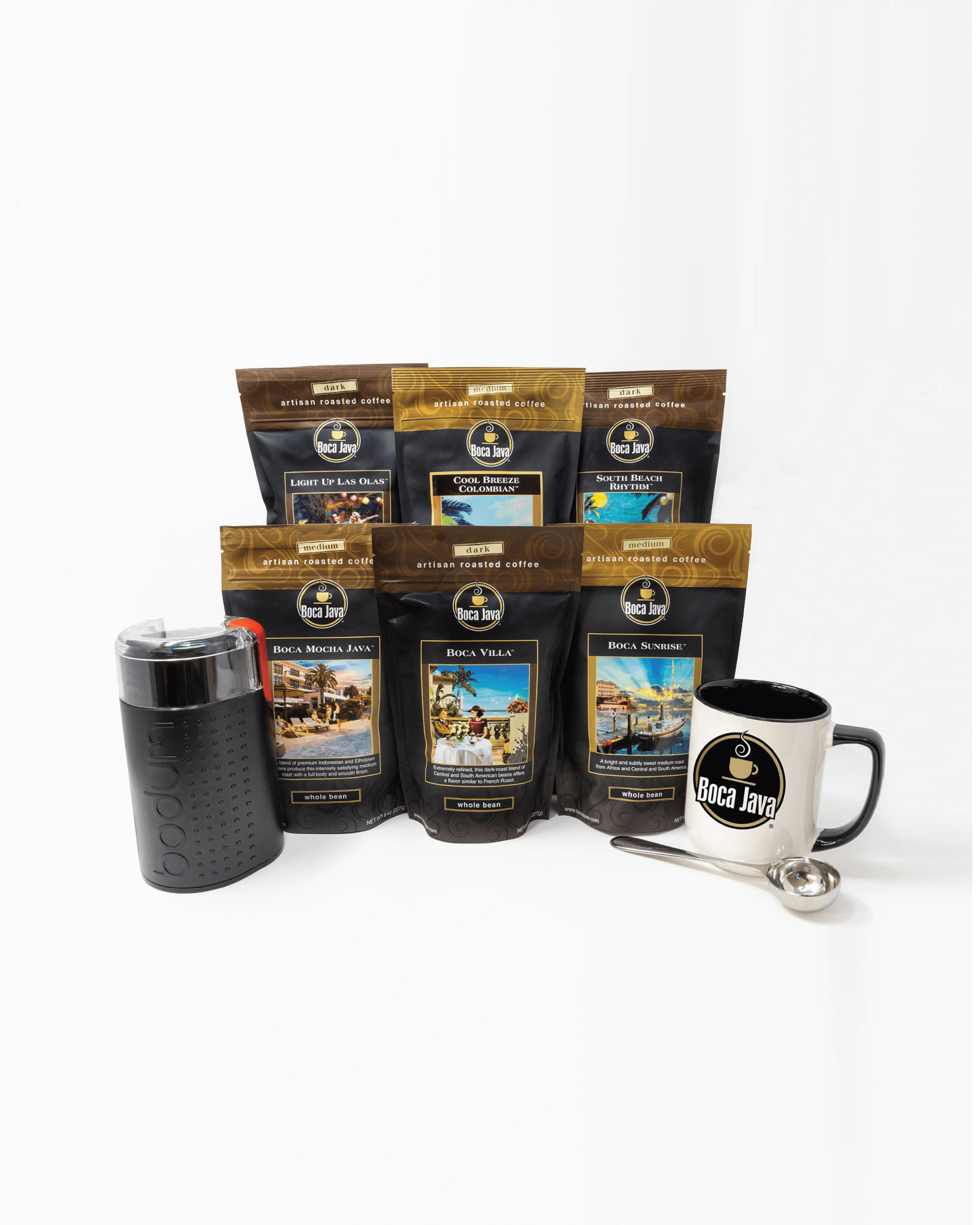 The Ultimate Coffee Gift Set includes six 8oz bags of Boca Java's most popular coffees made with the top 2% of handpicked, Arabica specialty grade beans and all the necessary accoutrements to enjoy the perfect cup of coffee, each and every morning.